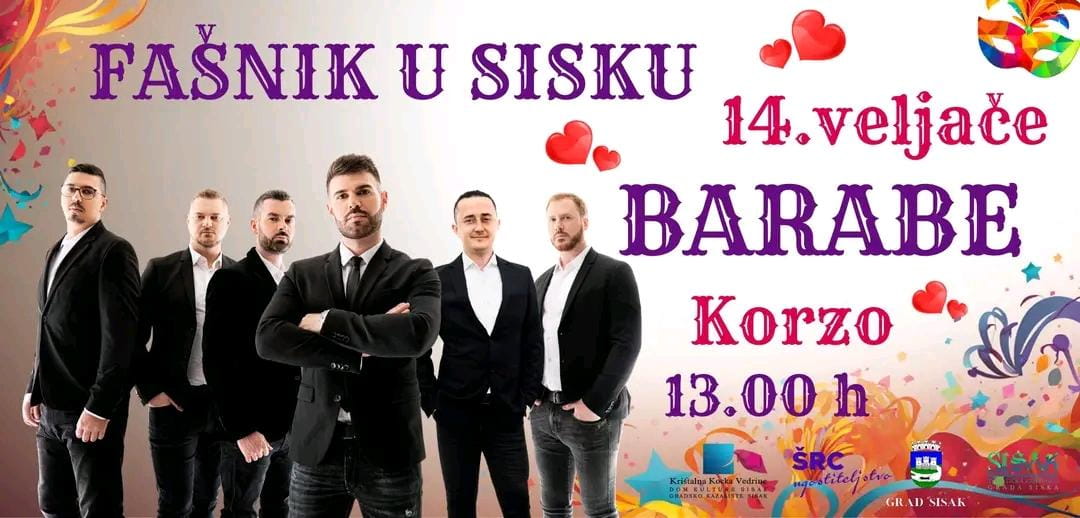 Danas nakon maškarane povorke, tradicije i veselja – pripremite se za glazbenu poslasticu! Očekuje vas koncert grupe Barabe, omiljenih kraljeva zabave koji će zapaliti fašničku pozornicu svojim energičnim ritmovima, hitovima i nezaboravnom atmosferom!