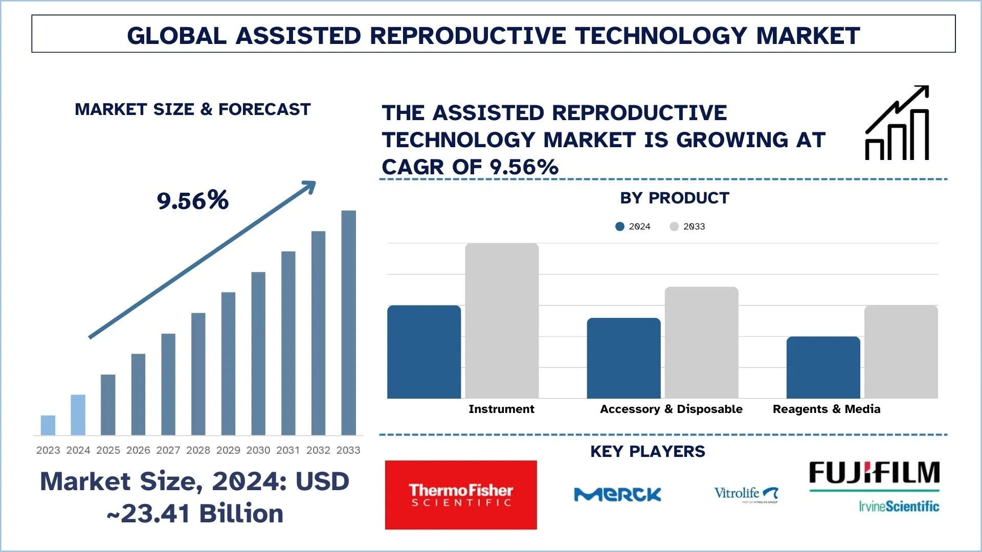According to the UnivDatos, rising infertility rates, delayed marriages, and growing technological advancements drive the Assisted Reproductive Technology market. As per their “Assisted Reproductive Technology Market” report, the global Market was valued at USD 23.41 billion in 2024, growing at a CAGR of about 9.56% during the forecast period from 2025 - 2033 to reach USD billion by 2033.