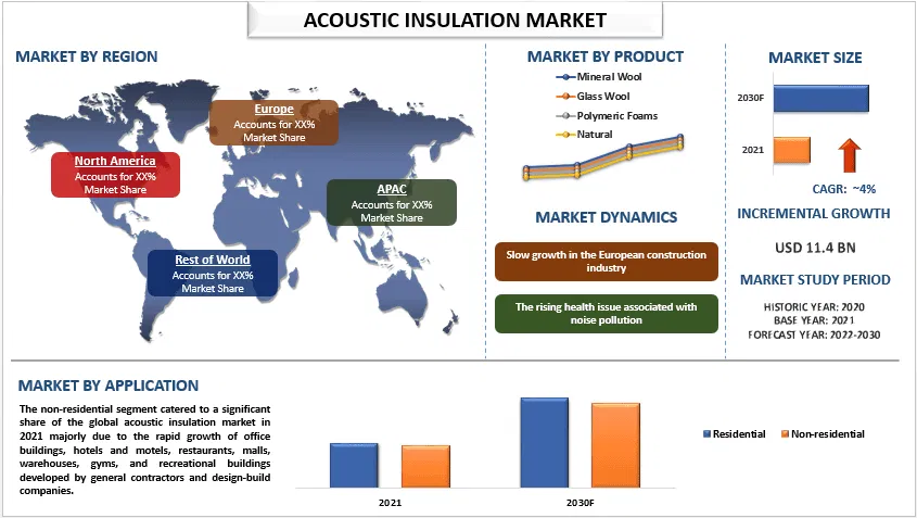 According to a new report published by UnivDatos Markets Insights, the Acoustic Insulation Market stood at 11.4 billion in 2021 and is expected to grow at a CAGR of around 4% from 2022-2030.