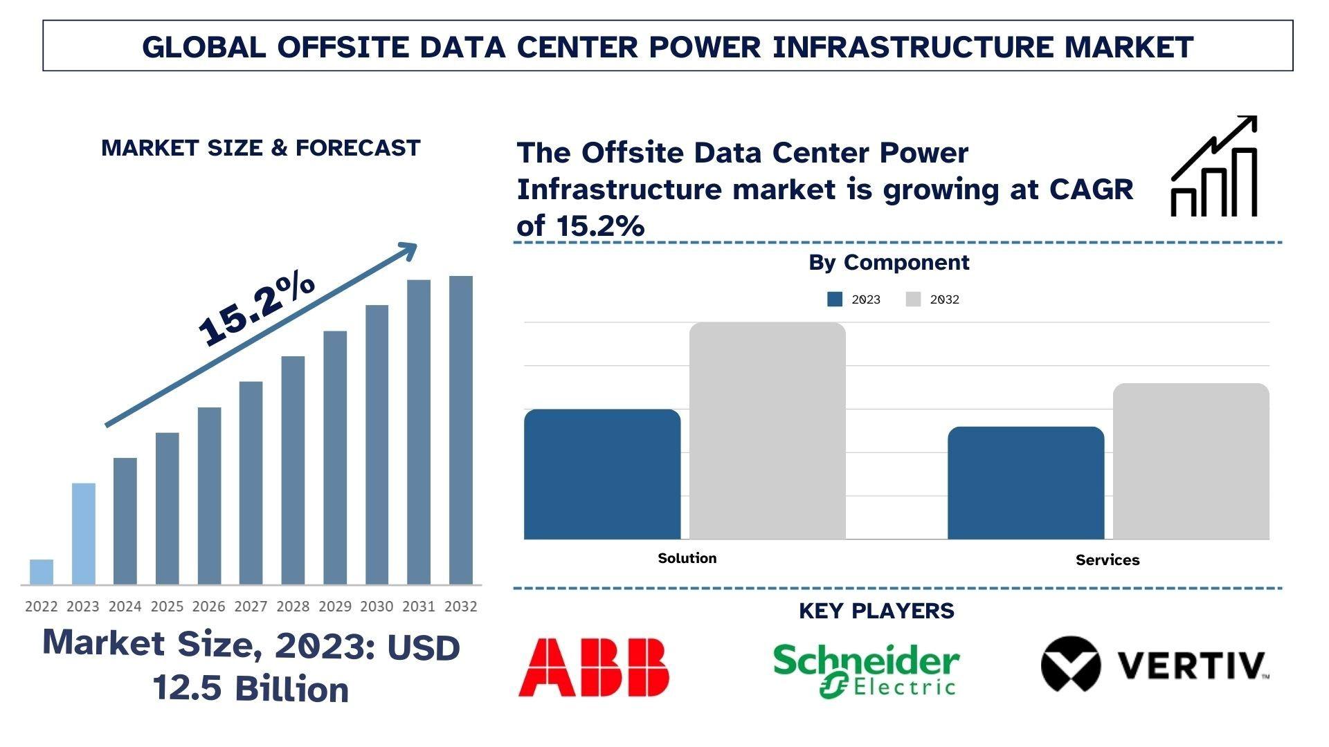 According to the UnivDatos, rising data consumption, increasing cloud adoption, growth in remote work, advancements in IoT and AI, and the demand for energy-efficient solutions are driving the growth of the offsite data center power infrastructure market. As per their “Offsite Data Center Power Infrastructure Market” report, the global Market was valued at USD ~ 12.5 billion in 2023, growing at a CAGR of about 15.2% during the forecast period from 2024 - 2032 to reach USD billion by 2032.