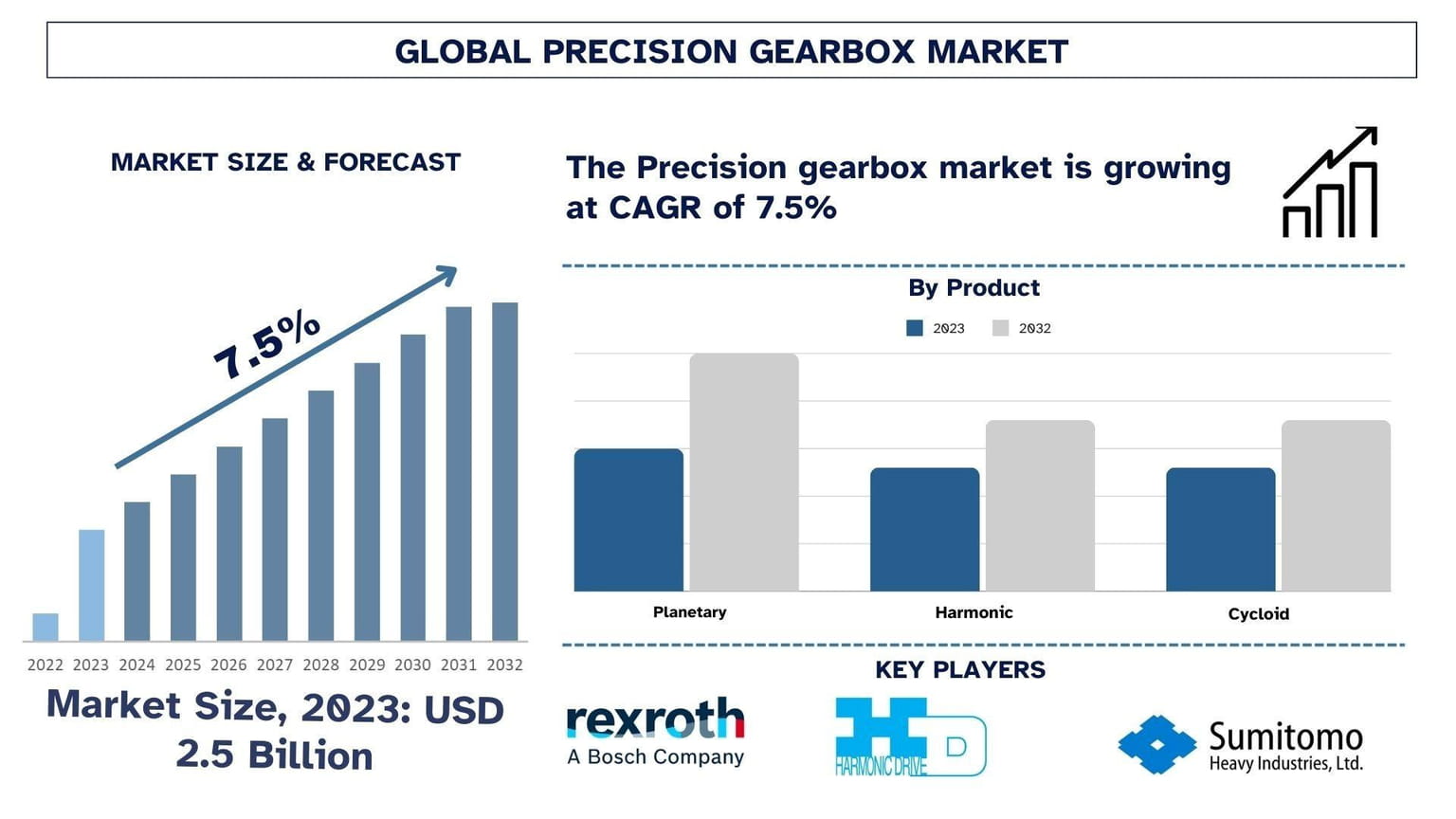 According to the UnivDatos, the market's growth is driven by rising automation across industries, demand for energy-efficient systems, and advancements in precision engineering technologies. As per their “Precision Gearbox Market” report, the global Market was valued at USD ~ 2.5 billion in 2023, growing at a CAGR of about 7.5% during the forecast period from 2024 - 2032 to reach USD billion by 2032.