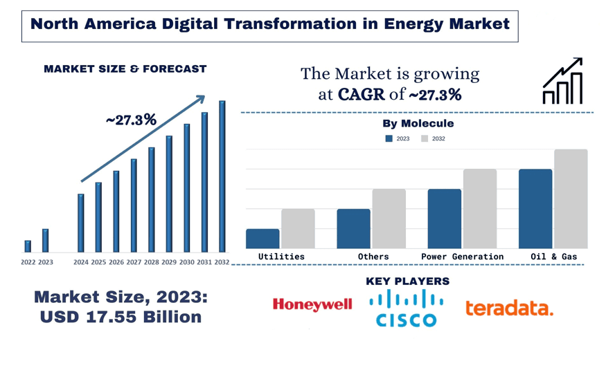 According to the UnivDatos, increasing investment in digital grid technologies in the region will drive the scenario of Digital Transformation in Energy and as per their “North America Digital Transformation in Energy Market” report, the Market was valued at USD ~17.55 billion in 2022, growing at a CAGR of 27.3% during the forecast period from 2024 - 2032 to reach USD billion by 2032.