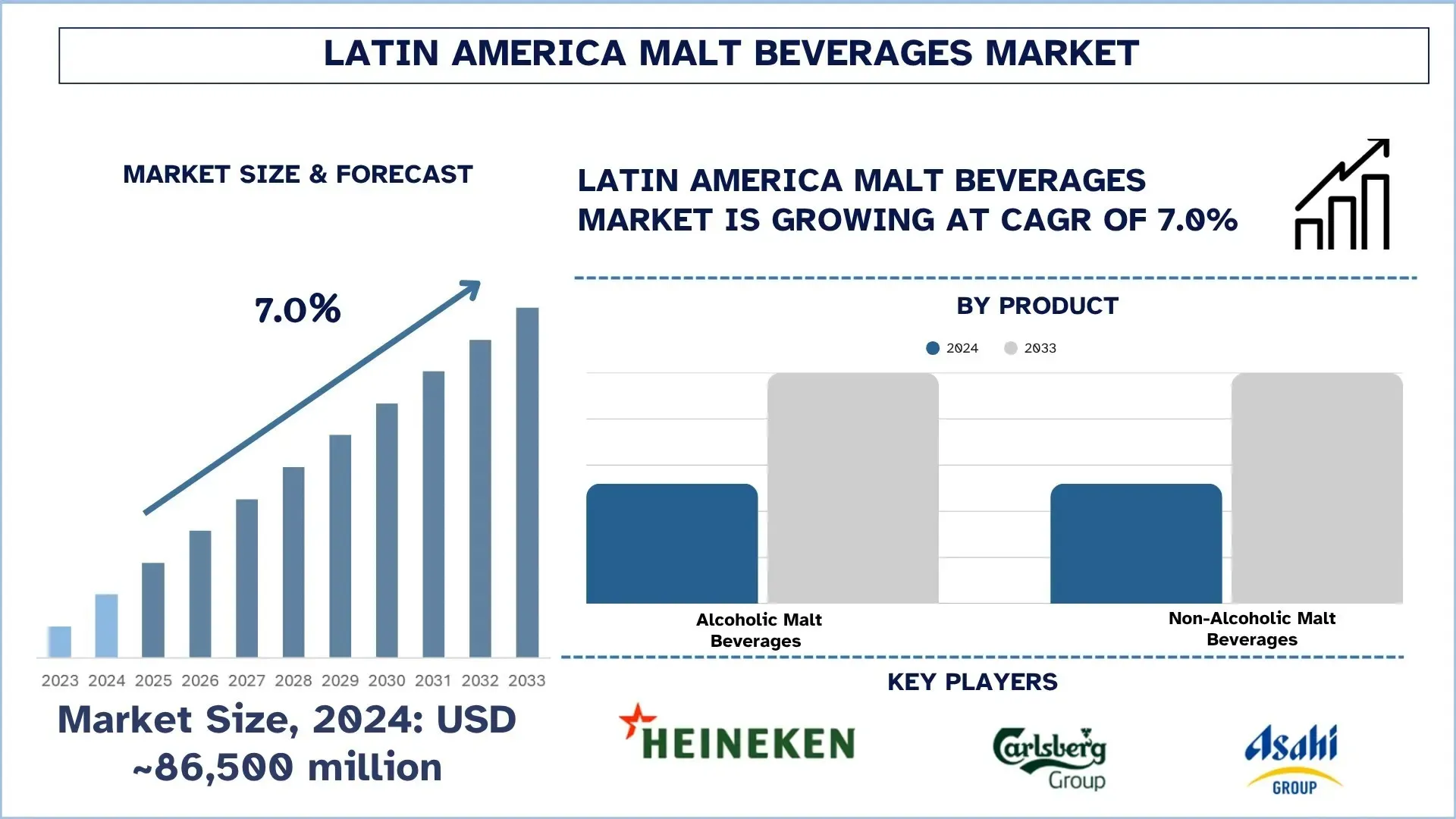 The Latin America Malt Beverages Market is expected to reach a market size of USD 86,500 million by 2024, with a CAGR of 7.0% from 2025 to 2033. Expanding Urban Middle Class, Fueling Premium Demand, and Shift toward Healthier and Low-Alcohol Options are some of the factors that have supported the market rise.