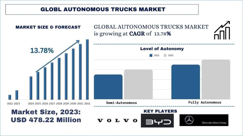 According to the UnivDatos, growing demand for fully autonomous trucks with increased range will drive the global scenario of autonomous trucks and as per their “Autonomous Trucks Market” report, the global Market was valued at USD 478.22 million in 2023, growing at a CAGR of 13.78% during the forecast period from 2024 - 2032 to reach USD 1527.84 million by 2032.