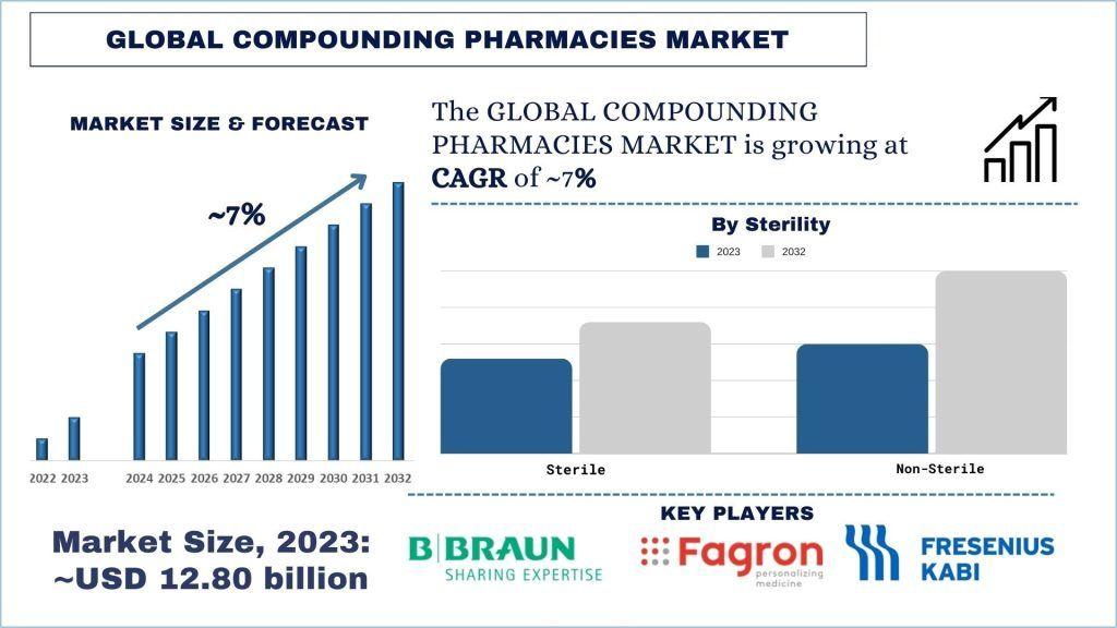 According to the UnivDatos, the increasing demand for personalized medicine, the rising prevalence of chronic diseases, and advancements in pharmaceutical compounding techniques will drive the global scenario of the compounding pharmacies market. As per their “Compounding Pharmacies Market” report, the global Market was valued at USD 12.8 Billion in 2023, growing at a CAGR of about 7% during the forecast period from 2024 - 2032 to reach USD billion by 2032.