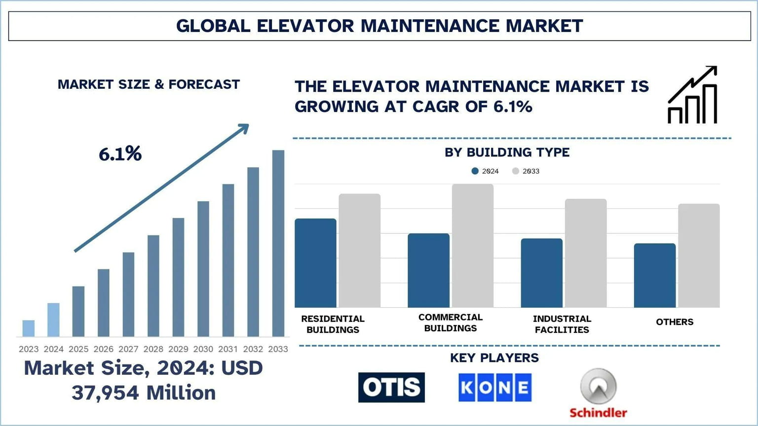 According to UnivDatos analysis, increasing installation of elevators and expansion of high-rise construction projects are major factors driving the growth of the elevator maintenance market. As per their “Elevator Maintenance Market” report, the global market was valued at USD 37,954 million in 2024, growing at a CAGR of about 6.1% during the forecast period from 2025 - 2033 to reach USD million by 2033.