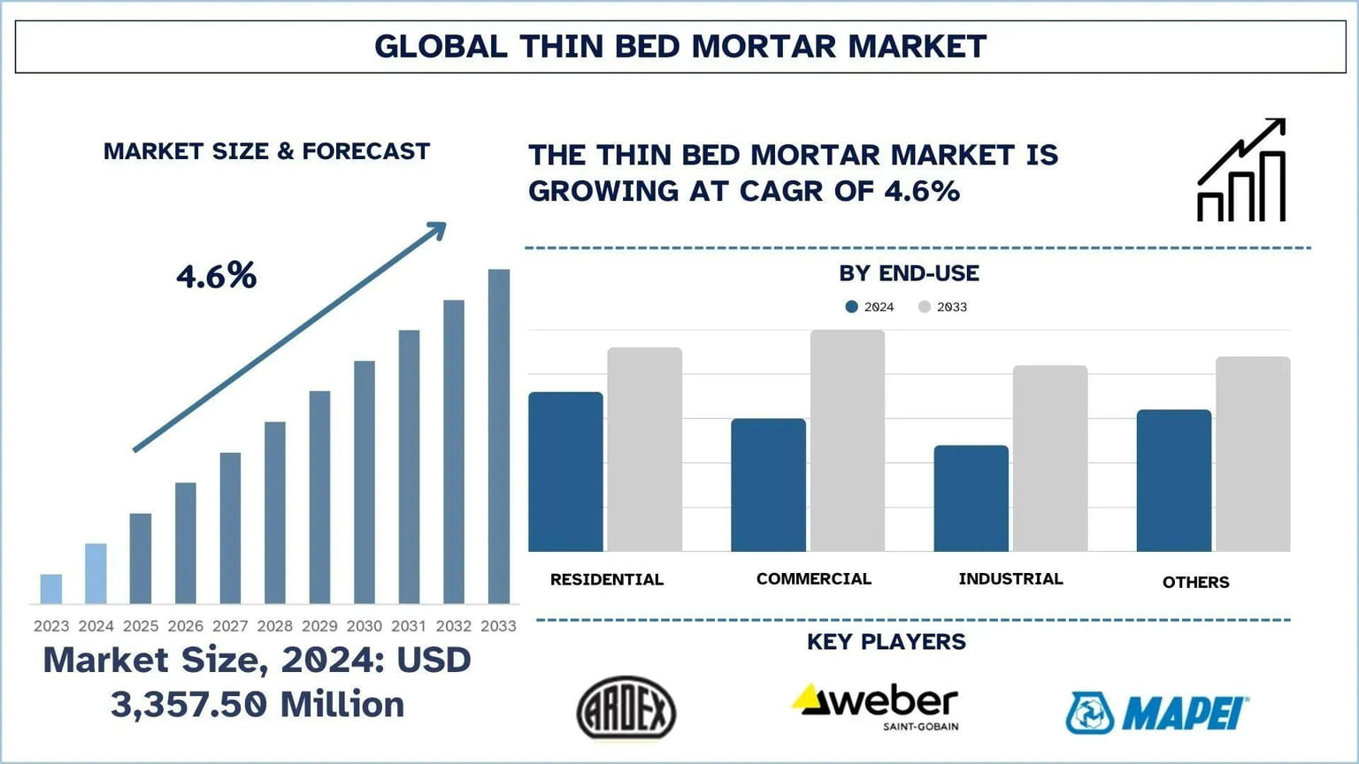 According to UnivDatos analysis, increased construction and renovation projects, along with growing government initiatives to promote infrastructure, are the major factors driving the growth of the Thin Bed Mortar market. As per their “Thin Bed Mortar Market” report, the global market was valued at USD 3,357.50 million in 2024, growing at a CAGR of about 4.6% during the forecast period from 2025 - 2033 to reach USD million by 2033.