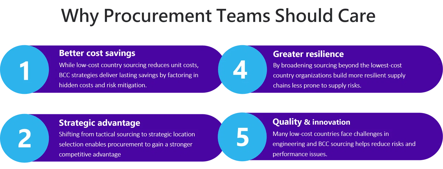 Procurement functions have evolved from transactional cost managers to strategic value creators. A well-executed Best Cost Country Sourcing initiative can: