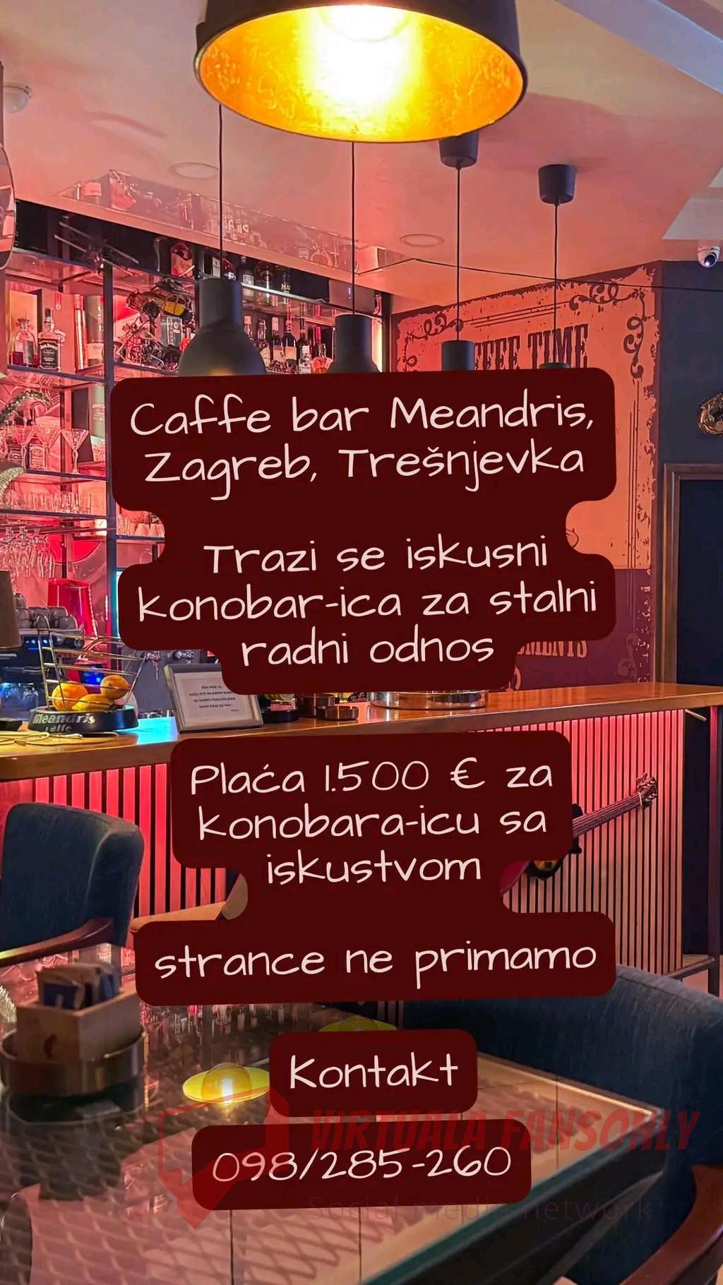 Sve ostale info u inbox ili na wap: 0976450481(OGLAS IZ USLUGE) Pozdrav svima! Trazimo odgovornu i urednu djelatnicu za rad na poziciji konobar/sanker. Lokal se nalazi u Zagrebu, Dubrava. -nudimo smjestaj ukoliko je potrebno -izradujemo radne dozvole -prijava obavezna -uredna placa -ugodna radna atmosfera Oglas je iskljucivo za osobe koje znaju hrvatski jezik! Sve ostale info u inbox ili na wap: 09764504810 Comments ·0 Shares ·831 Views -