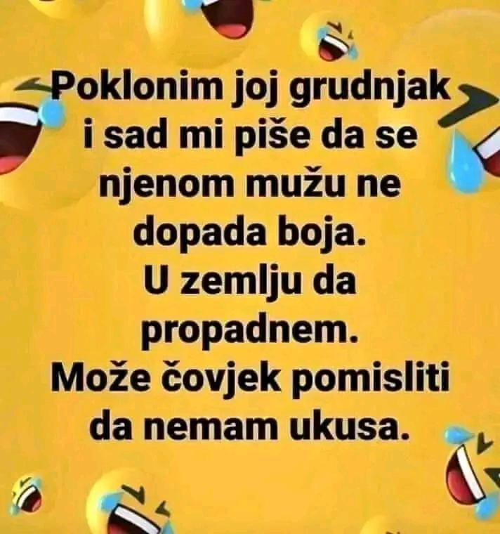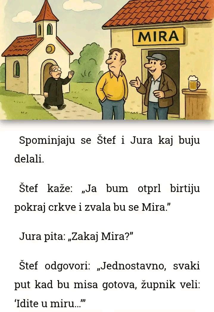 Kad mu cigo kaže; aha,jel vidiš već djeluju!Prolazio policajac po tržnici i vidi cigu,prodaje 3sjemenke od jabuke za 10€. Napisao "za bolje razmišljanje"!Pa mu kaže,to ti nitko ne bude kupio. Na to će cigo,eto kupi pojedi i ako ne budu djelovale vraćam novac. Kupi policajac sjemenke i pojede ih, nakon par koraka stane ,vrati se i kaže,vraćaj pare prevario si me. Mogao sam za te eure kupiti 10.kg jabuka i pojesti sve koščice. Kad mu cigo kaže; aha,jel vidiš već djeluju!0 Comments 0 Shares 53 Views5