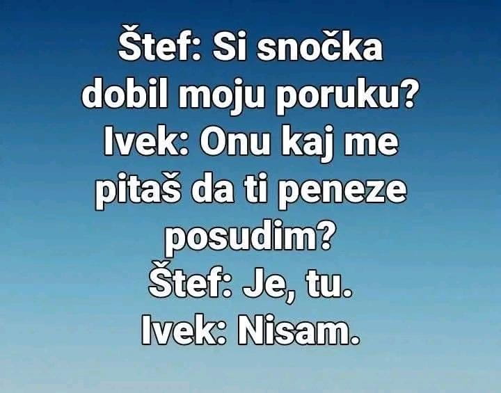 Pa da istovare ovih 18 crnogoracaČovjek otvorio firmu u Crnoj Gori. Poslovođi kaže da sutra dovede 18 jakih ljudi. Sutra dan dolazi kamion i u njemu 22 čovjeka. Gazda pita poslovođe zašto ih je 22 kada mu treba samo 18. Viđe vako , 18 je crnogoraca a ovih 4 su Bosanci. Pa šta ću ti tih 4 Bosanaca ? Pa da istovare ovih 18 crnogoraca0 Comments 0 Shares 30 Views7