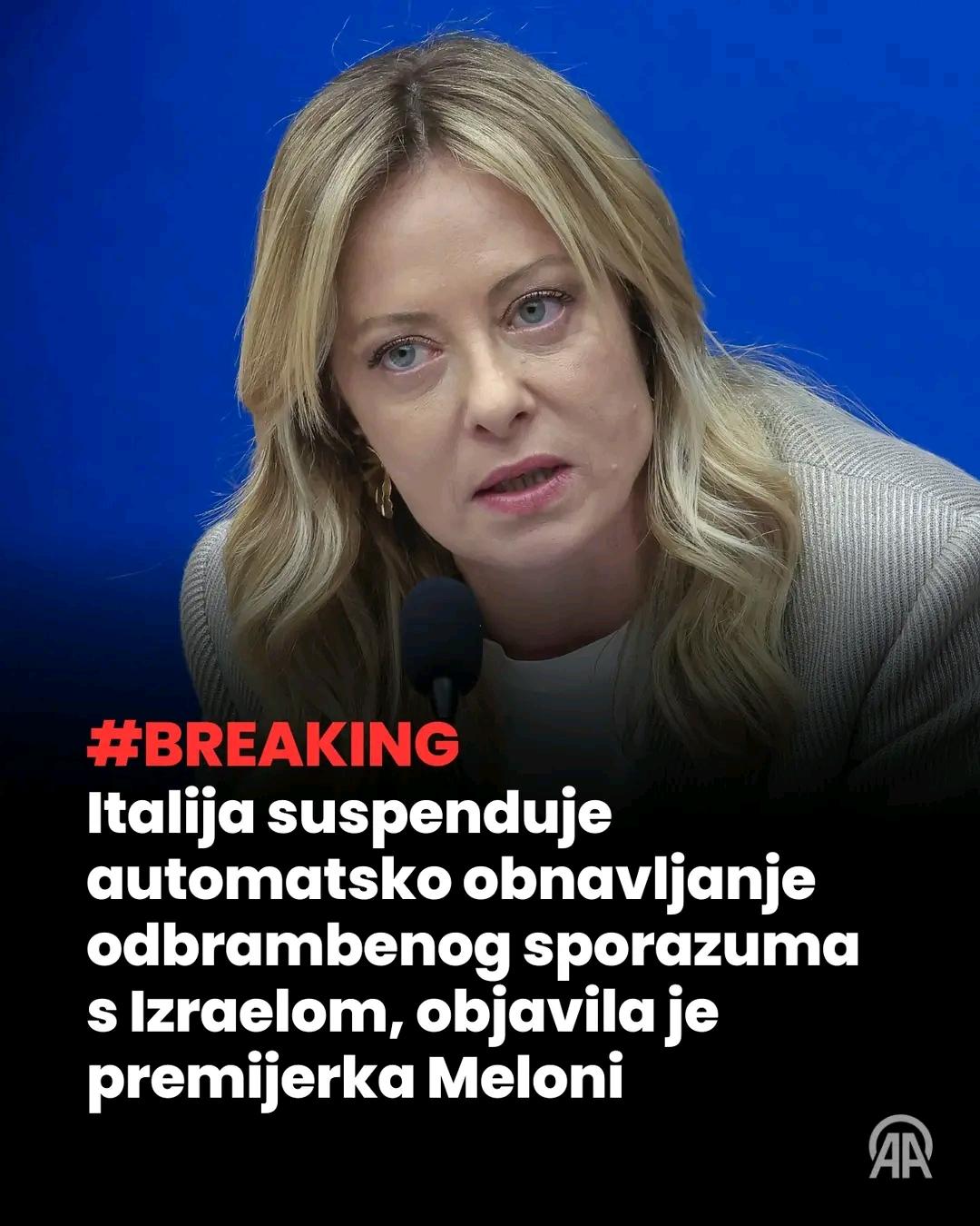 Italija suspendira automatsko obnavljanje odbrambenog sporazuma s Izraelom, objavila je premijerka MeloniItalija suspendira automatsko obnavljanje odbrambenog sporazuma s Izraelom, objavila je premijerka Meloni0 Comments 0 Shares 2 ViewsPlease log in to like, share and comment!